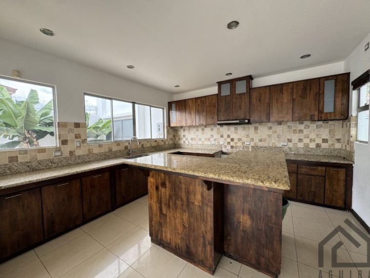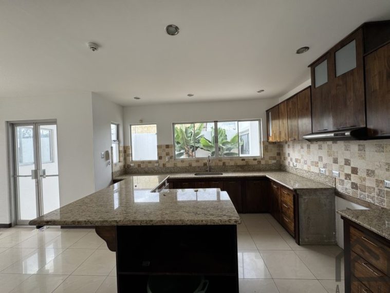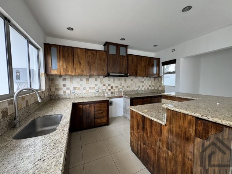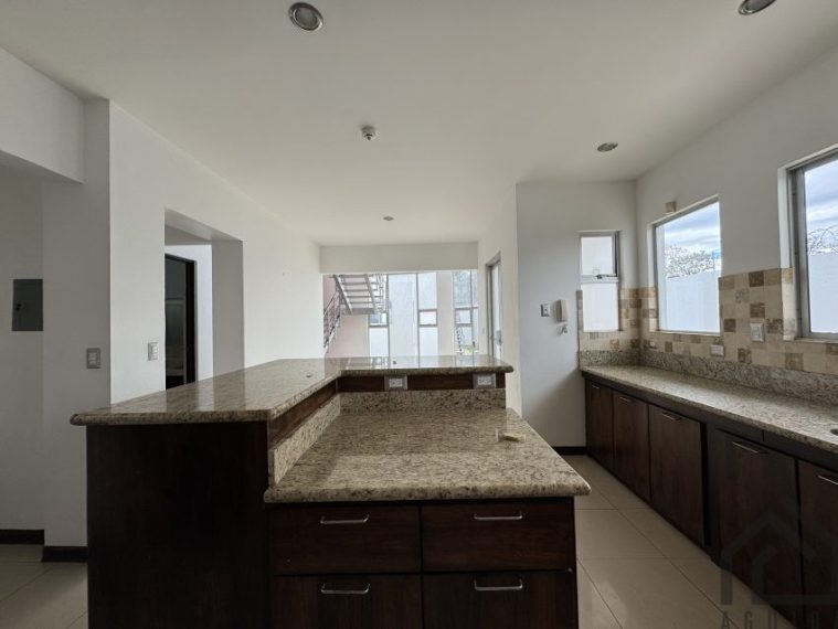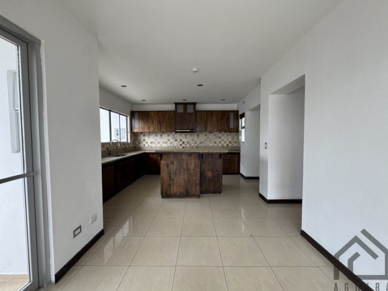 Cuenta con espacios amplios de sala, comedor,y cocina integrados, la cocina son sobre de granito y muebles de madera, en el centro tiene una isla para usarse como desayunador.